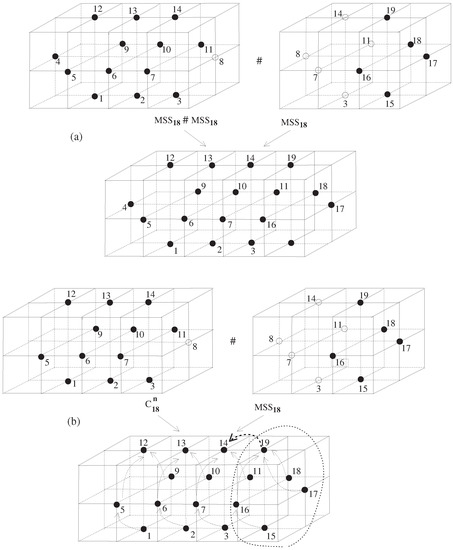 We call a set with a k-adjacency a digital image, denoted by [4,5,7,9,10]. In particular, in digital surface theory, we are absolutely required to consider a closed k-surface with a k-adjacency in a binary digital picture [19,20], where and the -adjacency is concerned with the set . In order to study in , we need the k-adjacency relations of which are generalizations of the commonly used k-adjacency of , , and k-adjacency of , . As a generalization of this approach into those of , a paper [17] firstly established the digital k-connectivity of , as follows: We say that distinct points are k-(or -)adjacent if they satisfy the following property [17] (for the details, see also [21,22]).