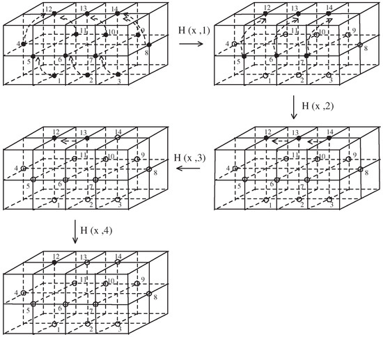 (Step 3) We denote the digital image being proceeded with (Step 2) with , i.e., . Then we see that the k-isomorphism f supports the non-AFPP (see the proof of Theorem 8). Indeed, although the set is equal to the set X, the subscript of each of all elements is completely changed from to , .