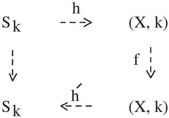 In Definition 3, if a k-continuous map is k-homotopic to a certain constant map , then we say that f is (pointed) k-null homotopic in [28]. In Definition 3, if , then we say that F is a pointed -homotopy at [28]. When f and g are pointed -homotopic in Y, we use the notation . In the case and , f and g are said to be pointed k-homotopic in Y and we use the notation and which denotes the k-homotopy class of g. If, for some , is k-homotopic to the constant map in the space X relative to , then we say that is pointed k-contractible [28]. Indeed, motivated by this approach, the notion of strong k-deformation retract was developed in [30].