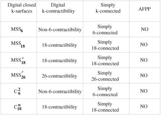 As a further work, based on Proposition 4, we need to further study the AFPP of according to the processes associated with Figure 3b(2), (3), and (4). As mentioned above, some homotopic features of the models , , , play important roles in digital topology and digital geometry because each of them can be considered to be the typical sphere-like model in Euclidean topology. Hence, the features referred to in Figure 9 facilitate studying many objects involving AFPP for digital images. Furthermore, the notion of digital connected sum also plays a crucial role in digital geometry because it can contribute to formulating another surface from two given surfaces. Besides, using the new topological structures in [36], we can study the FPP and AFPP of as subspaces of the newly-established topological structures. Finally, considering the geometric realization of a digital k-surface with an -structure in [37], we can deal with them from the viewpoint of computational geometry. In addition, after establishing a certain cone metric on a digital image [38,39,40,41,42], we need to further compare the current digital metric spaces using a length of simple k-path with cone metric spaces.