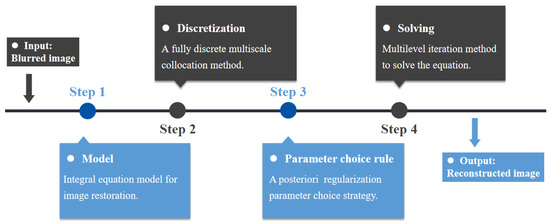 We present an overview flowchart for reconstructing an out-of-focus image in Figure 1. This process includes four main parts, that is, modeling, discretization, the parameter choice rule, and solving the equation.