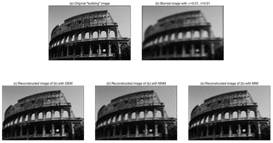 (a) The original clear ’building’ image. (b) Blurred image with and . (c–e) are reconstructed images of (b) with the GEM, the MAM, and the MIM.