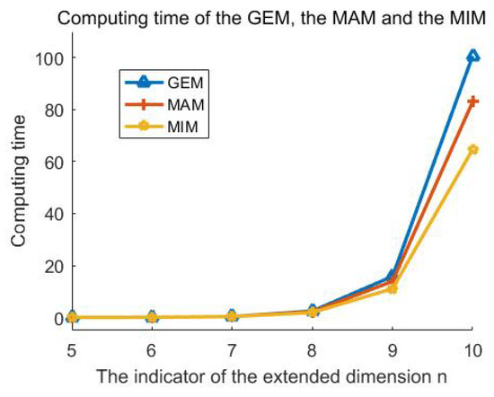 The second simulation was executed to verify the efficiency of the proposed multilevel iteration method. Figure 3a is the original clear ’building’ image with the size , and the blurred image is recovered in Figure 3b with in the blurring kernel and noise level using the MIM. For comparison, we also conducted experiments using the Gaussian elimination method (GEM) in [28] and the multilevel augmentation method (MAM) in [10]. , and represent the computing time of the Gaussian elimination method, the multilevel augmentation method and the multilevel iteration method, respectively. The value n listed in Table 2 ranges from 5 to 10, and in this case, the continuous intensity function (69) is needed. As shown in Section 2, two one-dimensional integral equations are solved to recover the blurred image. Therefore, the computing time here denotes the summation of the time needed to solve the coupled Equation (8) twice. In our MIM experiments, all processes stopped at the second iteration, which is very fast because of the good selection of the initial values and . These two initial values can be found in Step 1 of Algorithm 1. Figure 3c–e show the reconstructed images of (b) using the GEM, the MAM and the MIM. Meanwhile, Table 2 and Figure 4 exhibit the computing time of these three methods. On the whole, the computing time of the MIM is the least among the results of these methods. All results show the proposed multilevel iteration method requires less computational resources. The difference is obvious, especially when the indicator of the extended dimension n is large.