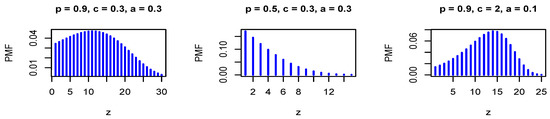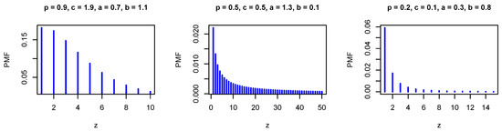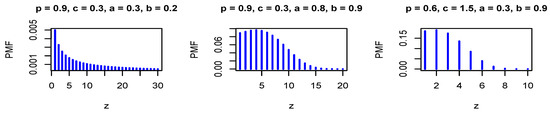 where . The PMF in Equation (27) is log-concave for some values of the model parameters, where is a decreasing function in z for some values of the model parameters. Figure 3 and Figure 4 show the PMF and HRF of the DGzW distribution for various values of the parameters.