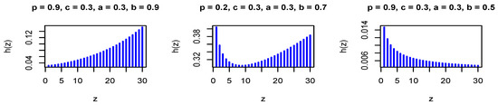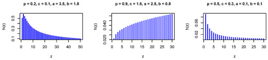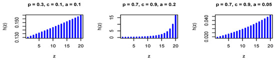 where . The PMF in Equation (26) is log-concave for all values of the model parameters, where is a decreasing function in z for all values of the model parameters. Therefore, it is strongly unimodal, it has all its moments, and the HRFs are increasing. Figure 1 and Figure 2 show the PMF and HRF of the DGzEx distribution for various values of the parameters.