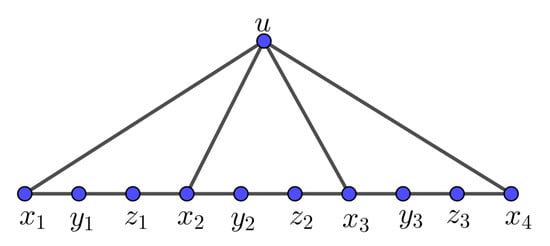 Then, each vertex is dominated for . Note that, after Dominator plays , there are at least undominated vertices. In each of Staller’s turns, he plays to dominate at most two new undominated vertices. Notice that, in each turn of Dominator, he can dominate at most three new undominated vertices. Therefore, the number of moves is at least . If , then the number of moves is at least . For , it can be checked that the number of moves is at least 5.