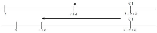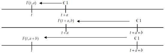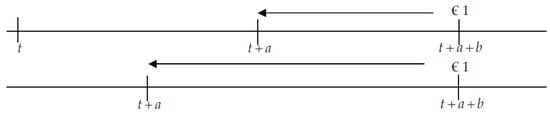 Observe that, in Definition 1, t and a represent the variable “time”, although t refers to a delay (a date or calendar time) and a refers to time as an interval. This distinction was already made by Scholten and Read [,,] for whom delay refers to the time counted from 0, and interval is defined as the difference of two delays. Analogously, Cruz Rambaud and Muñoz Torrecillas [] also made the same distinction, since they considered time as a point, that is to say, a date denoted by t, which refers to delay. On the other hand, the interval is considered as a period, for example, a week, a month, or a year, which is represented as a. Consequently, we can deduce that an interval can be considered as the difference between two delays.