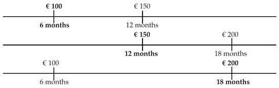 Assume the choice between €100 in 6 months and €150 in 12 (which is a 6-month subinterval), another choice between €150 at 12 and €200 at 18 (which is another subinterval of 6 months) and a last choice between €100 at 6 months and €200 at 18 (the interval here is 12-months length) (see Figure 2).