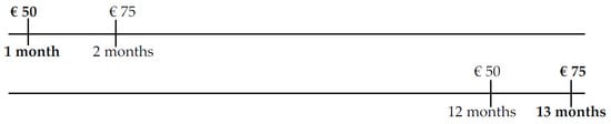 A person may prefer receiving €50 in a month or receiving €75 in two months; however, this same person may prefer €75 within 13 months to €50 within 12 months. Observe that, between the two rewards, there is a difference of one month (from 1 to 2 and from 12 to 13); however, the preferences of the decision-maker have changed, resulting in a time inconsistency which is incompatible with the exponential discount function, since we have gone from preferring the €50 reward in a month to prefer the €75 reward in month 13 (in both cases, there has been an increase of the delay in 11 months).