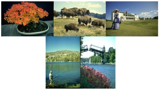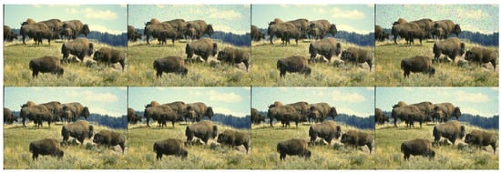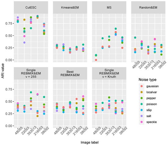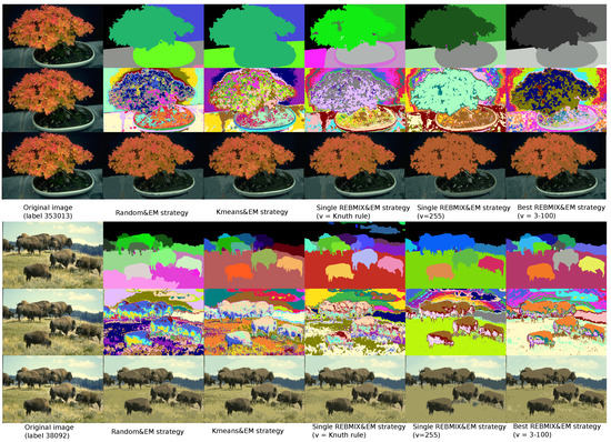 The image segmentations were carried out using the following strategies: the Single REBMIX&EM strategy, where the number of bins v was estimated using the Knuth rule; the Single REBMIX&EM strategy, where the number of bins v was taken to be ; the Best REBMIX&EM strategy, with the range of the number of bins being 3–100; and the Kmeans&EM strategy and the Random&EM strategy. The number of bins was taken as the color-channel value. The intensities of the RGB images only have integer values and, therefore, the frequency of each color channel is estimated. Furthermore, using , the marginal distributions of the color-channel value’s intensity are represented. The maximum number of components for each strategy is kept the same, i.e., . The threshold value for the EM algorithm was and the maximum allowed number of EM iterations was 1000.