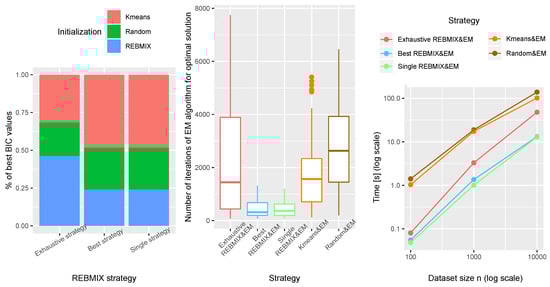 Figure 4 which are acquired on all artificial datasets. The first plot represents the percentage of selected GMM with the best BIC value for each REBMIX&EM strategy versus the Kmeans&EM and Random&EM strategy. Exhaustive REBMIX&EM selected better GMM on more datasets than Kmeans&EM and Random&EM strategy, judging by the BIC value. On other hand, strategies Best and Single REBMIX&EM had a smaller number of datasets on which they yielded best GMM in terms of BIC value than Kmeans&EM and equal to the Random&EM strategy. The second plot represents the box-plots of the EM iterations used by each strategy. The Random&EM strategy needed the largest number of EM iterations. Following this is the Exhaustive REBMIX&EM strategy, then the Kmeans&EM strategy, and the smallest number of iterations was needed by the Best and Single REBMIX&EM strategies. This is inferred based on the median value of the box-plots (horizontal line inside the box). In addition, the Best and Single REBMIX&EM strategies had a much smaller number of iterations of the EM algorithm, due to the fact that they had only one set of initial parameters for each number of components