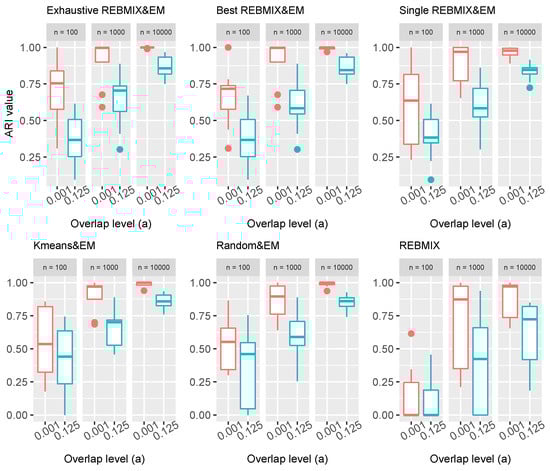 The performance of the Exhaustive REBMIX&EM strategy and the Best REBMIX&EM strategy on smaller datasets () with a lower degree of overlap was better than the multiple repeated Kmeans&EM and multiple repeated Random&EM strategy. The Kmeans&EM strategy improved the results for the datasets with a larger number of observations with smaller overlap although the Exhaustive REBMIX&EM strategy and the Best REBMIX&EM strategy performed equivalently or better. The Random&EM only had equivalent results on the largest datasets n = 10,000. The Single REBMIX&EM performed slightly worse than the Exhaustive REBMIX&EM strategy and the Best REBMIX&EM strategy, although equivalently to the Kmeans&EM strategy and mostly better than the Random&EM strategy. On the other hand, the datasets with larger overlap reduced the clustering performance of all the strategies, especially for datasets with and . In this context, the Kmeans&EM performed better than all the REBMIX&EM strategies for datasets with a small number of observations . On datasets with a larger number of observations only the Exhaustive REBMIX&EM strategy performed as well as the Kmeans&EM strategy, while only the Random&EM strategy performed poorly. On the datasets with the largest number of observations n = 10,000, the strategies Exhaustive and Best REBMIX&EM slightly outperformed the other strategies. We have also included the results we obtained just by running the REBMIX algorithm. For the K, we chose the 3–100 range—in other words, the same as for the Exhaustive and Best REBMIX&EM strategy. The results for the were mainly worse than the results from all the other strategies. As this number increased, i.e., and n = 10,000, the performance improved, although the other strategies still performed better.