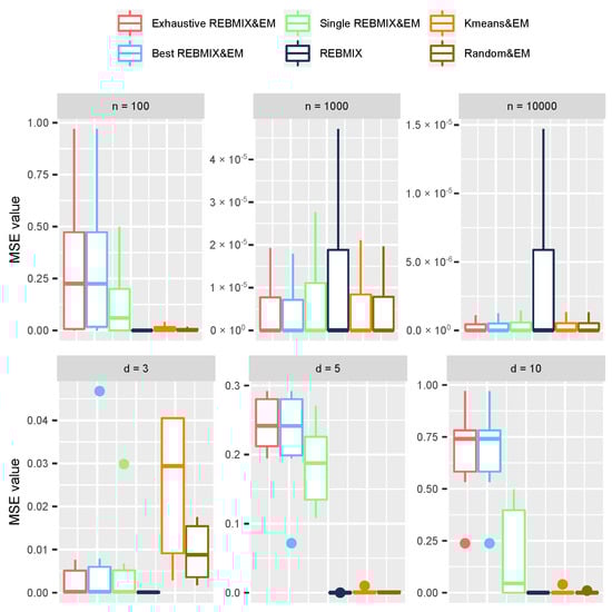 are the true GMM parameters from simulation. The choice of MSE instead of MISE was made here because the distributions used for sampling the datasets had higher dimensions, i.e., 3, 5, and 10, and the creation of the good integration grid requires a lot of computing power in terms of memory. The results are therefore presented as box-plots of MSE values in the upper plot in