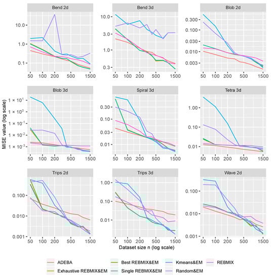 Figure 8. The Single and Best REBMIX&EM strategy far outperformed all the other strategies used and the ADEBA algorithm for all the dataset sizes, with the exception of size