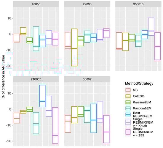 , the Kmeans&EM, Random&EM, and REBMIX had much better results than the REBMIX&EM strategies. To study more carefully why this happened, the box-plots for the datasets with