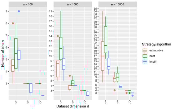 Figure 6. These box-plots are grouped by the number of observations in the dataset. Again, for the estimation, we have used all the strategies and the stand-alone REBMIX algorithm.