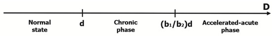 A diagram of the transition from normal hematopoiesis to chronic and accelerated-acute stages in CML is presented in Figure 1. Notice that the length of the interval that corresponds to the chronic phase is and depends on the ratio . The bigger the ratio is, the larger the interval in which a patient’s parameter D can lay in chronic phase. Notice that the patient-related parameter gives the ratio of contributions of the normal and abnormal stem cells to the diminution of the nonrestrictive growth rate of the normal cell population, aiming to restore homeostasis.