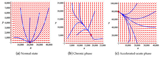 Phase portrait of the two-dimensional system (4)–(5), in the normal state (a) ; in the chronic phase (b) and in the accelerated-acute phase (c) . The orbits approach the unique asymptotically stable equilibrium (represented by a thickened red point): , in case (a); , in case (b); , in case (c).
