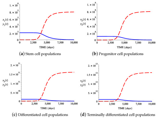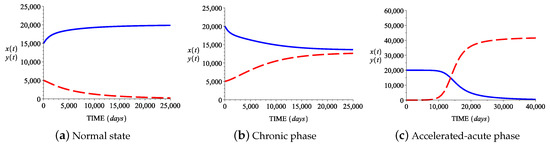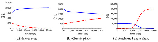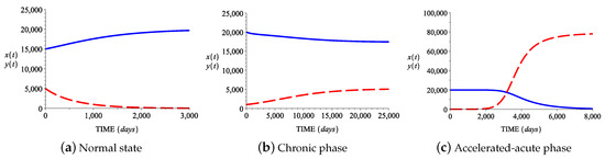 Case I: In this case the growth and death rates of normal stem cells are smaller than the growth and death rates of abnormal stem cells. Figure 3a shows the behavior in time ( days) of the two cell populations for the parameter values provided in the first line in Table 2, values that correspond to the normal hematopoietic state (). The normal stem cell population (blue solid line) tends to the value d while the abnormal stem cell population (red broken line) tends towards 0. Biologically, this mutant/abnormal cell extinction, due to random events, has been explained and demonstrated in several studies using stem cell lineages (see Jilkine and Gutenkunst [35], Driessens et al. [36], Klein et al. [37], Lopez-Garcia et al. [38], and Snippert et al. [39]). Figure 3b shows the behavior in time ( 25,000 days) of the two cell populations for the parameter values from the second line of Table 2, values that correspond to the chronic state . The normal and leukemic stem cell populations , tend toward and , respectively. Figure 3c shows the behavior in time ( days) of the two cell populations for the corresponding parameter values from Table 2, values that lead to the accelerated-acute state . The normal stem cell population tends towards , while the leukemic stem cell population tends to the value .