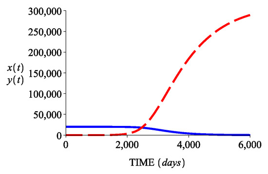 Case II: Here the growth rate of normal stem cells is smaller than the growth rate of abnormal stem cells, and the death rate of normal stem cells is greater than the death rate of abnormal stem cells. Then , and since , we immediately see that , or equivalently . Hence, in this case only the accelerated acute state is possible. Figure 4 shows the behavior in time ( days) of the two cell populations for the corresponding parameter values from Table 2. The normal stem cell population tends towards , while the leukemic stem cell population tends to the value .
