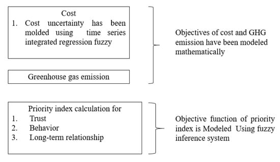 In this research paper, a multi-objective, multi-period, vehicle routing supply chain problem considering cost, GHG emission, and priority index is proposed. All desired objectives of GHG emission, cost, and priority index (player’s qualitative characteristics) have been developed. Figure 1 shows the procedure for developing the objectives of cost, GHG, and priority index. Priority index is a novel objective considered in the proposed optimization model. Fuzzy inference system is employed to model qualitative characteristics. A rule-based fuzzy inference system (FIS) converts these qualitative attributes into numbers, which is termed as priority index. The optimization of multi-objective models considering qualitative characteristics (priority index) along with GHG emissions and cost uncertainty has been rarely reported in the previous literature. As these objectives are conflicting in nature, a multi-objective optimization method has been employed to achieve efficient solutions. The model assumptions are shown in Figure 2.