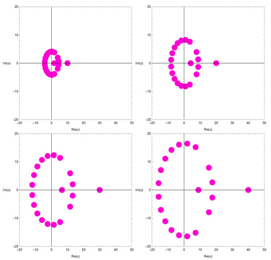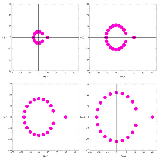 We investigate the beautiful zeros of the qGTEP by using a computer. The zeros of the qGTEP for are displayed in Figure 6.