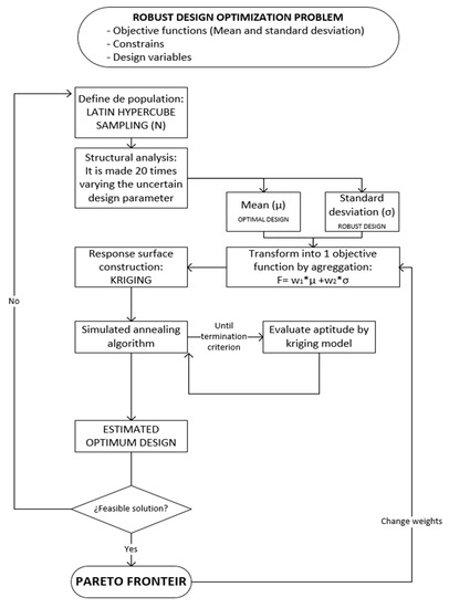 The main goal of metamodels is to obtain results more efficiently by creating a mathematical approximate model of a detailed simulation model (model of a model). This makes it possible to predict output data (objective response) from input data (variables or design parameters) of the design space. There are three main steps to create a metamodel: (1) obtaining the initial points of the input or sampling data set within the design space (size and position), (2) choosing the method to create the approximate mathematical model, and (3) choosing the fitted model. Each of these three steps can be performed using many different options [25]. In this study, Latin hypercube sampling is used to obtain the initial sampling, the kriging model is used to create the approximate mathematical model, and the search for the Best Linear Unbiased Predictor (BLUP) is used as the fitted model. Then, the mathematical approximation created is used to predict the objective functions according to the initial design variables and parameters. In this way, the optimization can be carried out more efficiently, saving a lot of computational costs, which is important in a probabilistic optimization. In addition, the simulated annealing algorithm is used to perform the optimization. Figure 2 shows a flowchart of the robust design optimization using these characteristics. A more detailed description of this approach can be seen in Penadés-Plà et al. [24].