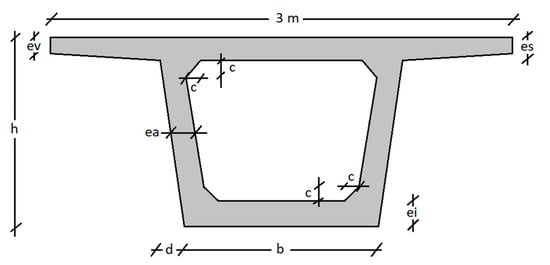 The structure is a concrete pedestrian bridge with three continuous spans of 40–50–40 m long. The box-girder cross-section has a uniform width of 3 m, and seven variables define the remaining geometric dimensions of the cross-section (Figure 3): depth (h), web inclination width (d), bottom slab width (b), bottom slab thickness (ei), top slab thickness (es), external cantilever section thickness (ev), and webs slab thickness (ea). The variables are restricted to a range as shown in Table 1. The haunch (c), is determined from the other variables (Equation (6)) as recommended by Schlaich and Scheff [35]. Furthermore, the haunch must also allow space to enclose the ducts in the high and low points. This structure was used to compare the standard heuristic optimization and kriging-based heuristic optimization. In this work, the kriging-based heuristic optimization and RDO are applied to the same structure. More detailed information about this structure can be found in Penadés-Plà et al. [24].