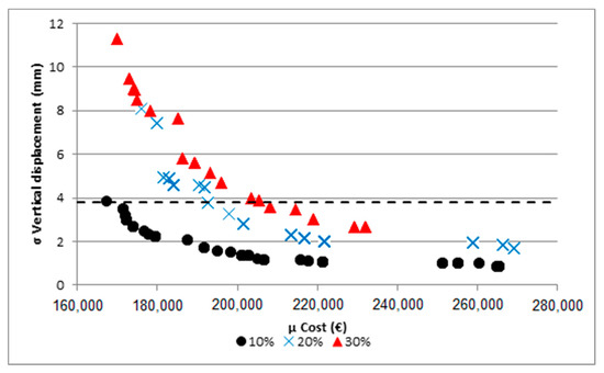 Figure 4 shows the Pareto frontiers for the different uncertainties of the modulus of elasticity considered. This figure represents the mean of the cost against the standard deviation of the vertical displacement of the middle of the bridge. It shows that an increment of the uncertainty of the modulus of elasticity causes a displacement of the Pareto frontier, moving away from the positive ideal point (lowest μcost and lowest σvertical displacement). This is because the design of the structure should resist all the possible values of the uncertain parameter. Therefore, a higher variation of the initial uncertain parameter imposes greater requirements on the design and an increment of the cost.