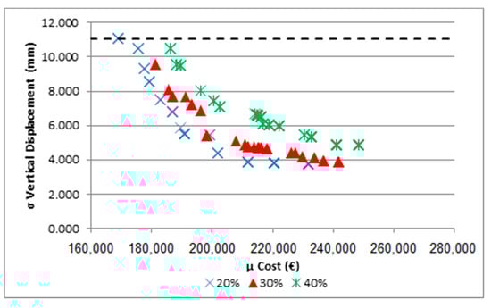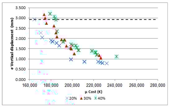 Table 4 shows a comparison between the designs of the different Pareto frontiers with the same structural behavior. In this case, the reference value taken into account is the standard deviation of the vertical displacement of the cheapest design of the Pareto frontier with the lowest variation of the modulus of elasticity studied. In this way, an imaginary horizontal line will intersect all the Pareto frontiers (dashed line of Figure 4). Solutions S10, S20, and S30 are selected, which correspond to a σvertical displacement lower than 3.82 mm. It shows that to reach similar structural behavior, the price increases with an increment of the uncertainty of the modulus of elasticity and that the design variables that cause this increment of the price are the depth and fck. Both are higher for each increment of the variability of the modulus of elasticity.