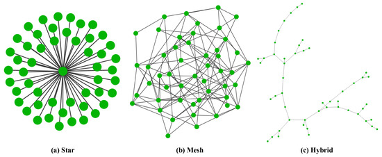 Simulation on Military and Industrial phenomena; in (a) hybrid topology, (b) mesh topology and (c) star topology.