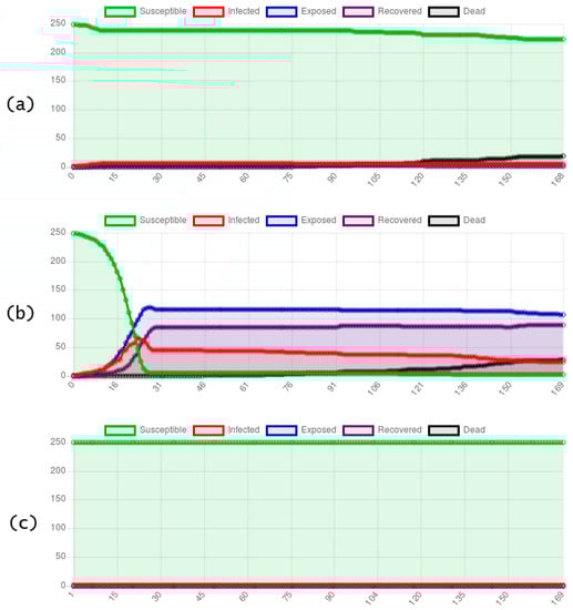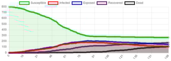 It is supposed that the population of nodes remains constant, consequently: at each step of time t. For a given time t, N is the total number of agents, stands for the number of susceptible agents, represents the number of agents in exposed state, are the infectious agents, denotes the agents in the recovered state and, finally, is the total number of agents in dead state.