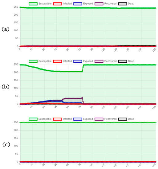In a small world, two non-neighbouring nodes can communicate with each other, through other neighbouring nodes, with a small number of jumps. In this case, the spread of infection has amplified rapidly, distributed between infected nodes and similarly exposed nodes. When the infection has progressed, the nodes have begun to recover; however, a significant number of infected nodes have started to lose their energy and become dead. In summary, the network can lose data due to intercommunication failures between nodes (see Figure 8).