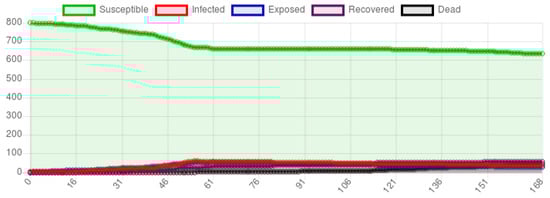 In a free-scale network, the number of links in a node is different for each of them. In this case, the spread of the malware has started slowly, then the number of infected nodes and exposed nodes has increased similarly. However, recovery of nodes has started early; therefore, the infection has been able to be controlled quickly, and it has spread in only about 20% of the network (see Figure 7).