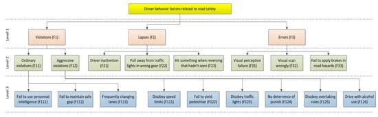 The second part of DBQ designed on Saaty scale (1977) to analyze the significant driver behavior factors related to road safety. For evaluation purposes, the driver behavior factors were designed in a three-level hierarchical structure and symbolized each factor with alphabet ‘F’ as shown in Figure 1. These driver behavior factors have a significant influence on road safety. Some recent studies considered the specified driver behavior factors for evaluation of road safety performance by different evaluator groups [50,51,52].