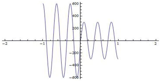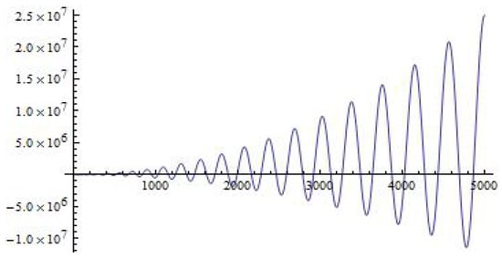 Below we illustrate the graphical simulation of the second fundamental solution  for some values of eigenparameter . Namely, the graphs of the second fundamental solution  for ,  and  are shown in Figure 5, Figure 6 and Figure 7, respectively.