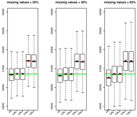 Missing Not at Random case. Boxplots of compared estimators for missing rates 20%, 40%, and 60%. Green line is the true population mean. Blue square is the average over simulations runs.