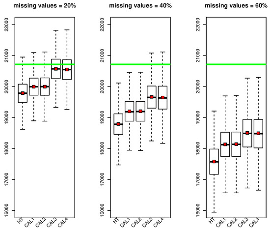 - It is noteworthy that the estimators cal1 and cal2 have a similar behavior to each other as well as cal3 and cal4. It is also observed that the estimators cal1 and cal2 have less variability in general than cal3 and cal4.