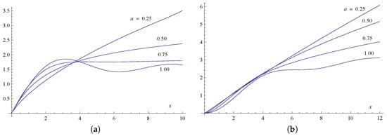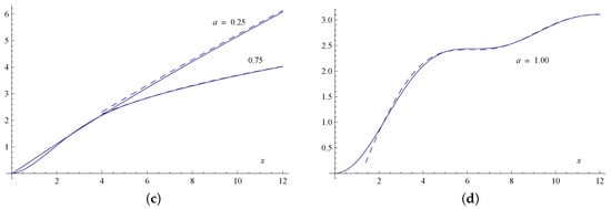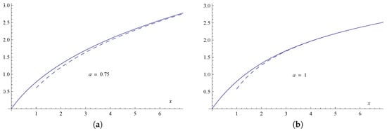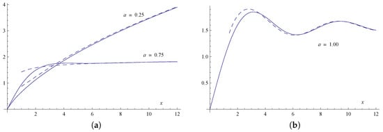 Finally, in Table 3 we present the error associated with the expansions of the generalised sine and cosine integrals and as given in Theorems 3–5. For , the logarithmic expansion in (30) arises for and ; for the logarithmic expansion in (31) arises for . In Figure 3 are shown plots (We remark that the plot of in Figure 3b differs from that shown in Figure 4 of Reference [].) of and for different and in Figure 4 the leading asymptotic approximations from the expansions in Theorem 5 are compared with the corresponding plots of these functions.