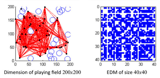 In Figure 2, the distances between the neighboring nodes are connected by red lines; whereas, for non-neighboring nodes, their distances are calculated by solving which is done using the method of trilateration. The distances that have been calculated will be transformed into the partial EDM and, hence, will proceed with the process of matrix completion, as explained in Section 4.1.