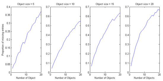 Graphs of the effects of object size to the proportion of missing entries for object size equal to 5, 10, 15, and 20 cm.