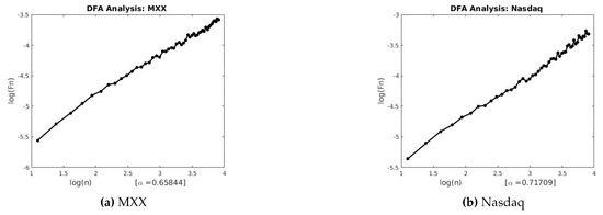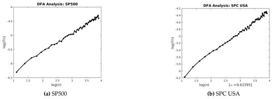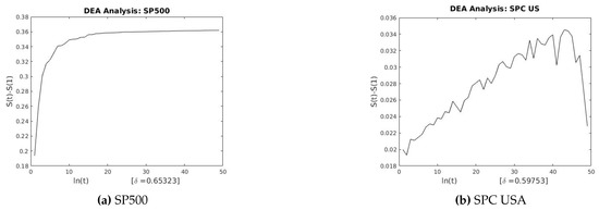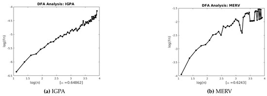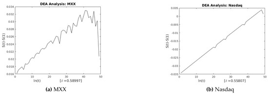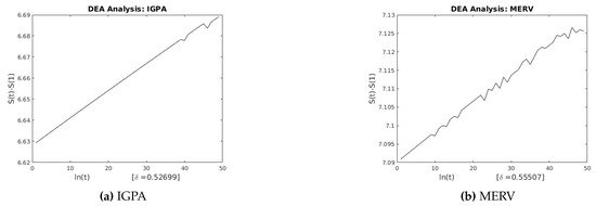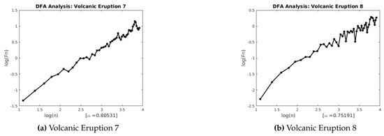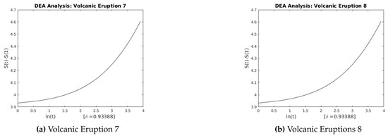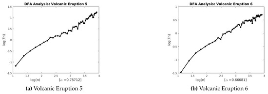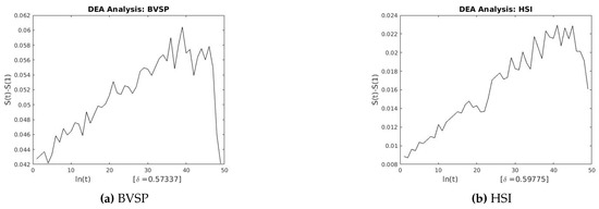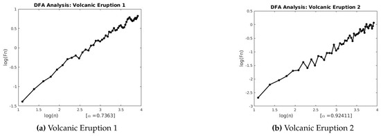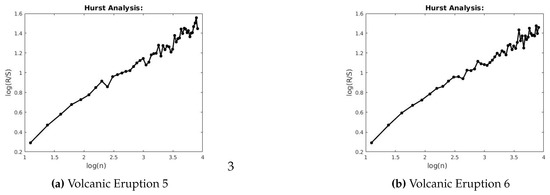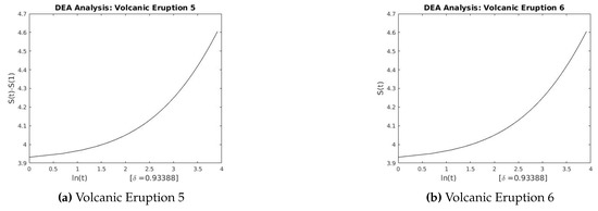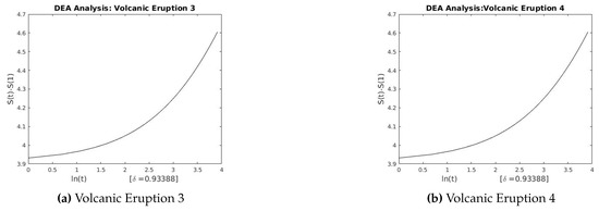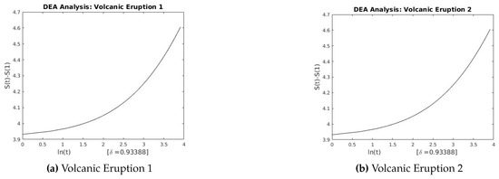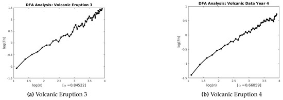 This section describes the analysis of financial indices and volcanic time series when our models are applied to the data sets. Table 3 and Table 4 show the scaling exponents derived from applying the three scaling methods. The , and exponents are used to obtain and . The Hurst analysis of financial indices and volcano time series are shown in Figures 2–6, 17–20. The slope of the best straight line fitted on the logarithmic plot of rescaled range (R/S) versus time is the Hurst exponent (see Table 3). Figures 7–11 and 21–24 summarize the DFA analysis of financial indices and volcanic eruption, showing the linear trend when plotting and on a log-log scale. A linear relationship on a double log graph indicates that there is a scaling or self-similarity in the graph, and the fluctuations can be characterized by scaling exponent. Table 3 and Table 4, Figures 7–11 and 21–24 show that the scaling exponent is less than 1, which confirms the presence of long-range correlations, that is, the large values are likely to be followed by large values and vice versa. So the DFA allows us to study the correlations in data, without disturbance of seasonality or trend. In Figures 12–16 and 25–28, we notice that there is a considerable difference between the DEA analysis of financial indices and volcanic eruptions data. Unlike the financial indices, of the volcanic eruption data is increased almost exponentially with the logarithm of time scale.