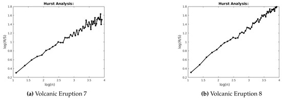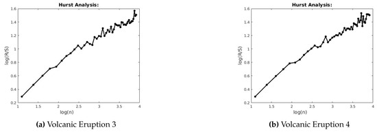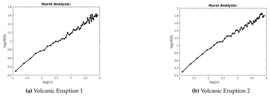 In this section we present figures obtained from our numerical simulation of the financial and volcanic time series data after we applied the R/S analysis, the DFA and the DEA. Figure 2, Figure 3, Figure 4, Figure 5 and Figure 6 show the log-log plot from the R/S analysis applied on the financial time series. Figure 7, Figure 8, Figure 9, Figure 10 and Figure 11 show the log-log plot of F(n) versus (n), showing the linear trend in the plot. Figure 12, Figure 13, Figure 14, Figure 15 and Figure 16 show the linear-log plot of the financial time series. Figure 17, Figure 18, Figure 19 and Figure 20 show the log-log plot from the R/S analysis applied on the volcanic eruptions. Figure 21, Figure 22, Figure 23 and Figure 24 show the log-log plot of the DFA applied to the volcanic time series. Figure 25, Figure 26, Figure 27 and Figure 28 show the quadratic-log plot of the DEA applied to the volcanic time series.