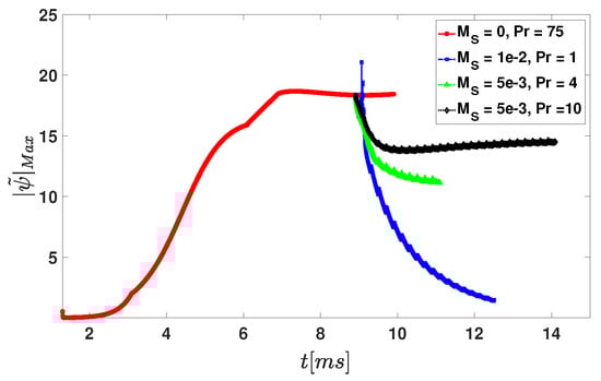 In a range of and for the same value of , the mode saturates at lower amplitudes for lower values of , see for example green dashed dotted line vs black dotted line in Figure 1, corresponding to and , respectively. We note that the simulations show that as the is lowered, while keeping the fixed, the saturation amplitude is lower. Whilst it would be reasonable to expect that the saturation level to be higher at the lower values of viscosity (i.e., lower ), the opposite is observed.