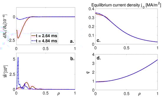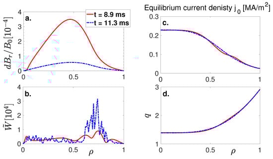 The profiles of the (a), (b), equilibrium current density (c), and safety factor q (d) for the mode case, at time ms corresponding to (red solid lines), and ms corresponding to (blue dotted lines).