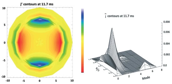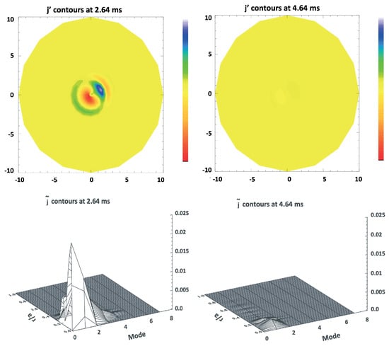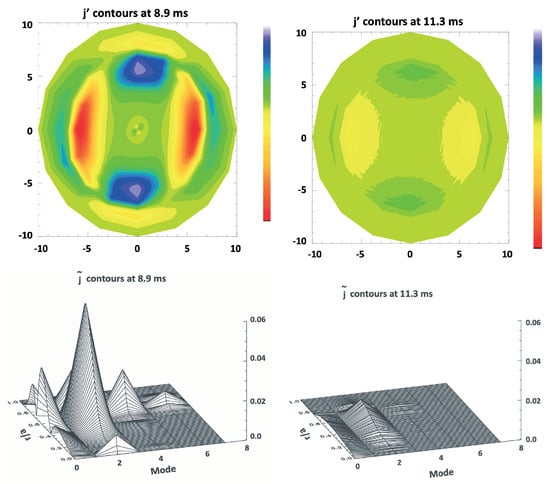 Figure 3 illustrates the contour plots (top) and the corresponding spectra (bottom) of the current density fluctuations at the selected times. The poloidal structure of the (2,1) mode remains visible at ms. However, the amplitude is reduced significantly. This can also be seen in the spectra plots where a strong reduction of the current density fluctuation amplitude is obtained.
