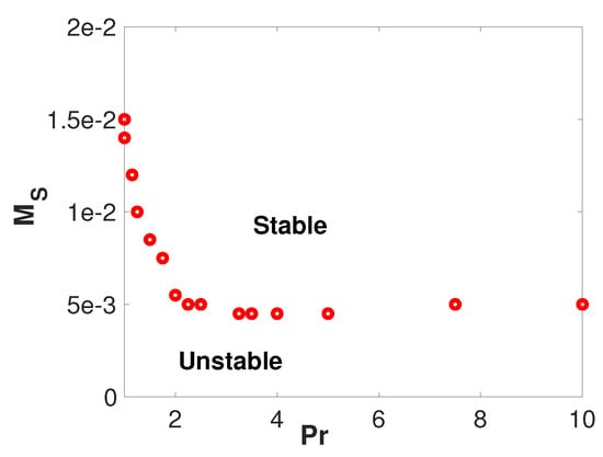 The stability boundary for (2,1) mode as functions of Prandtl number, , and the amplitude of the stochastic ZFs, .