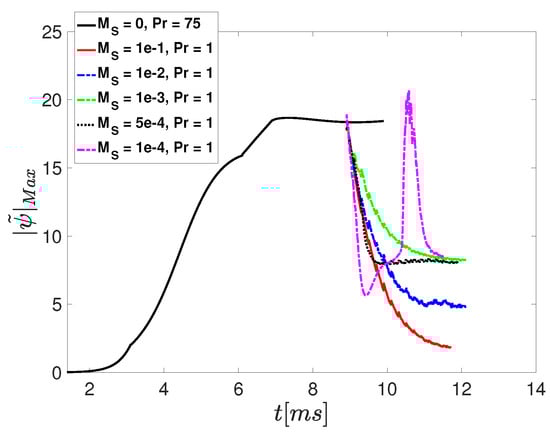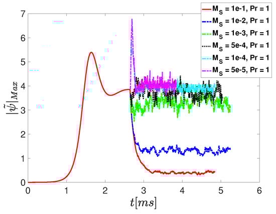 Time evolutions of the for (1,1) mode for (black solid line) and (all other lines) for various levels the Mach number of the stochastic ZFs, .
