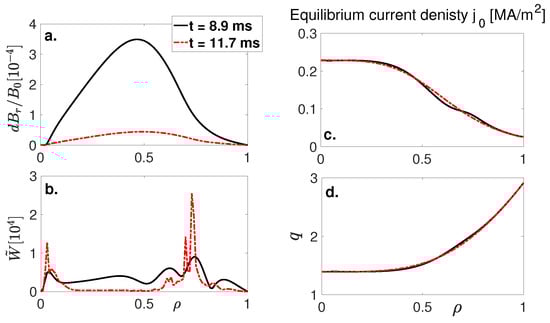 Figure 6a–d show a comparison of the profiles of the , , equilibrium current density , and safety factor q between ms and ms, without and with the stochastic ZFs, respectively. The equilibrium current profile in the final saturated state, is almost back to its original linearly unstable profile, in the case where (see Figure 6c). However, the saturated mode amplitude is low , thus, the overall ZFs Mach number is of the order of .