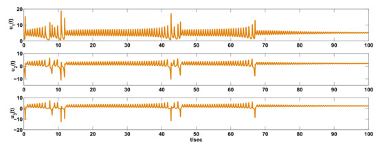 Moreover, three-dimensional phase diagram of the states of (13) with fractional order and the time response of the states and and and and of the drive-response systems (13) and (14) with fractional order are showed in Figure 8, Figure 9, Figure 10 and Figure 11. In Figure 12, Figure 13 and Figure 14, we have showed synchronized time response for the same states of the drive-response systems (13) and (14) with fractional order Finally, time response of the states for the error system (15) with fractional order is showed in Figure 15.